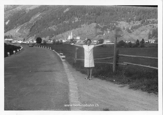 Das Kennzeichen und der Autotyp* lassen vermuten, dass die Reisenden wohl zu US-Truppen in Deutschland gehörten. Lässig posiert die Dame auf dem Zaun, im Hintergrund ist die Brücke nach Plazchörf zu erkennen, welche die RhB-Geleise überspannt (unten links), die Formen des Autohecks sind beeindruckend! Die zeitgenössischen Lederhandschuhe der Dame im weissen Kleid (rechts unten) lassen erahnen, dass sie den Amischlitten gefahren ist.