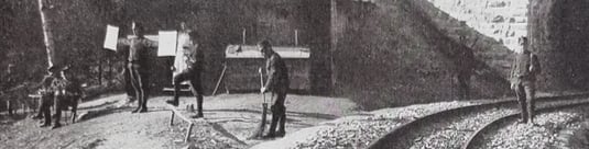 Kaum sichtbar am Rand ein Soldat, fast wie ein Gitarrenspieler. Daneben zwei Armeeangehörige auf Stühlen. Sehr interessant ist der mit zwei weissen Tafeln dastehende Soldat - ob er wohl eine Art Übermittlung damit macht? Von hier aus sind Poschiavo und die andere Talflanke gut sichtbar. Hinter der einen Tafel könnte noch eine Frau (Köchin) in hellem Gewand stehen, davor ein Soldat dem linken Fuss auf dem Geländer. In Bildmitte wischt wohl der sogenannte 'Hamburger' (Dienstjüngster) den Vorplatz. Im Schatten rechts bewacht einer mit umgehängtem Gewehr das Tunnelportal, zusammen mit dem Kollegen neben dem Gleis.