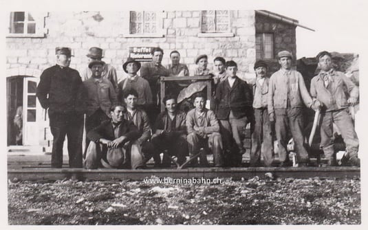 Capostazione Arnoldo Lardi mit 14 Arbeitern. Seine lederne Mütze zeigt, dass die Aufnahme noch zu Berninabahn-Zeiten gemacht woren ist. Im Hintergrund huscht eine Person durch die Türe. Es könnte sich aufgrund der Kleidung um einen Soldaten handeln. Dann wäre das Bild zwischen 1939 und 1940 entstanden (AL war bis 1940 dort tätig)