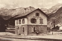 Hier ist das Ristorante Stazione zu sehen, in den über hundert Jahren hat sich an diesem Holzchalet nicht viel verändert. Seit kurzem ergänzt ein separater moderner Betonbau das Angebot um ein paar Zimmer, deshalb heisst es jetzt "Ristorante Pensione Chalet Stazione". Webseite www.chalet-poschiavo.ch