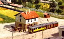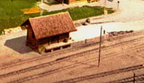 Hier sehen wir das beschauliche Züglein vor dem ebenso bescheidenen Stationsgebäude. Ob die Holzhütte hinten rechts ein Toilettenhäuschen ist?