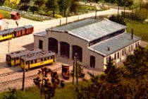 Hier eine schöne Ansicht des "symmetrischen Kerns" des Depotgebäudes. Brav stehen zwei kurze Triebwagen davor, neben den Gleisen möglicherweise der Turmwagen X1.