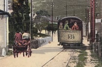 Diese Postkarte habe ich in meiner nun 10-jährigen Sammlerkarriere zum ersten Mal gesehen. Sie zeigt sehr schön die Lage der Berninabahn in der staubigen Strasse auf. Autos gab es ja zu diesem Zeitpunkt bekanntlich noch keine im Kanton Graubünden, der Platz reicht für Bahn und Kutsche.