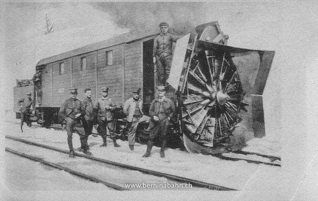 DIe Inbetriebnahme war eine grosse Sache, nicht nur für die SLM, sondern auch für die Berninabahn. Das Bahnpersonal hatte keinerlei Erfahrung mit Dampfantieben und diese neuartige Technik zur Entfernung des Schnees war auch ein Quantensprung gegenüber der Handhabung der einfachen Schneepflüge - vom vielen Schaufeln von Hand ganz abgesehen!