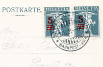 Zudem ist der Frankaturwert der Briefmarken von 7 1/2 Rappen auf 5 Rappen überstempelt. Wer sich da genauer auskennt, möge das doch bitte kommentieren, vielen Dank!