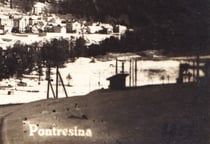 Hier eine sehr seltene Karte von der Einfahrt in Pontresina. Man erkennt beide Schienenstränge der RhB und der Berninabahn und die Holzmasten.